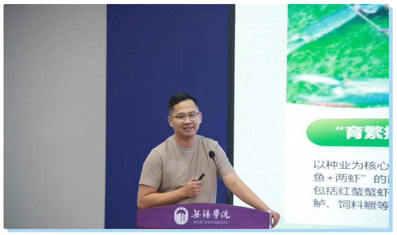 江苏中水东泽总经理助理李宇辰先生发表了题为《促进三产融合 致力乡村振兴》的主题演讲。李宇辰先生生动阐述了公司如何以创新、绿色、开放、共享的发展理念为引导,持续进行科技投入,以种业发展为核心驱动力,构建高附加值淡水鱼虾类的健康生态养殖模式和健康养殖服务体系。他强调,公司正致力于打造可推广、可复制、能够持续盈利的生态养殖模式和产品流通体系,力求实现农业经济体的共同利益,为全力推进中国式现代化锡山新实践贡献力量。