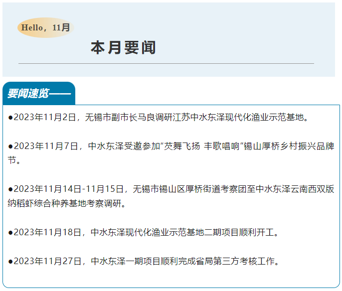 2023年11月2日,无锡市副市长马良带队调研江苏中水东泽现代化渔业示范基地,无锡市锡山区区委副书记、区长顾文浩,锡山区副区长鲍雪峰以及锡山区厚桥街道党工委书记桂彬陪同调研。