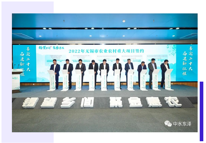 2022年10月14日,在无锡市举行的 “锡望乡间 聚金惠农”金融服务乡村振兴系列活动启动暨农业农村重大项目签约仪式上,无锡市锡山区厚桥街道谢埭荡村委书记华东明与江苏中水东泽农业发展股份有限公司总经理沈夏作为双方代表进行了现场签约。